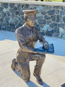 July 1, 2021 By Kelsey Bronze kneeling soldier presenting folded American Flag with bronze chair and battlefield cross. The American Legion Post 147 Kia Memorial is located in Medford, WI.
