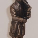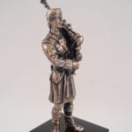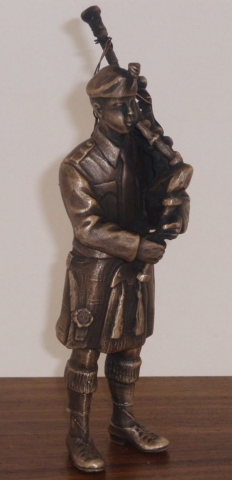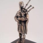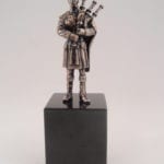 The 6″ bagpiper statue comes mounted on a standard walnut base with a cast bronze replica badge and engraved brass plate. It can be personalize with your chest badge, arm patches. and the style of hat the bagpiper wears. Hat styles include the Balmoral, Glen Garry or a Feather Bonnet. Specify the gender and race when ordering.