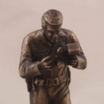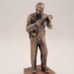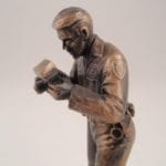The Crime Scene Investigator statue is dressed in a jumpsuit and is holding a camera to photograph the crime scene. This 6″ miniature bronze statue is mounted on a finished walnut base with a cast bronze replica badge and engraved brass plate.