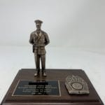 ThisĀ 6″ bronze statue includes the customization of your uniform and equipment and any special Honor Guard dress items, choice of male or female, race, cast-bronze badge replica, & engraved brass plate mounted on finished walnut base.