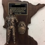 The BDUs figure depicts a figure dressed in camis and boots. Includes all customization of uniform and equipment. Specify sex and race. Comes mounted on a standard walnut base with replica bronze department badge and an engraved brass plate.