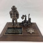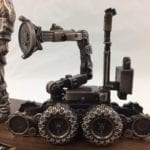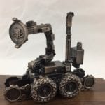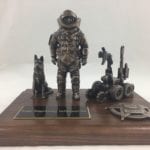 The bronze disposal robot is 4″ wide and 3″ tall. It comes mounted on a standard walnut base with a replica bronze badge and a brass engraved plate. Also, can be ordered with both the Bomb Squad technician and robot on the same base with the replica badge and brass engraved plate.