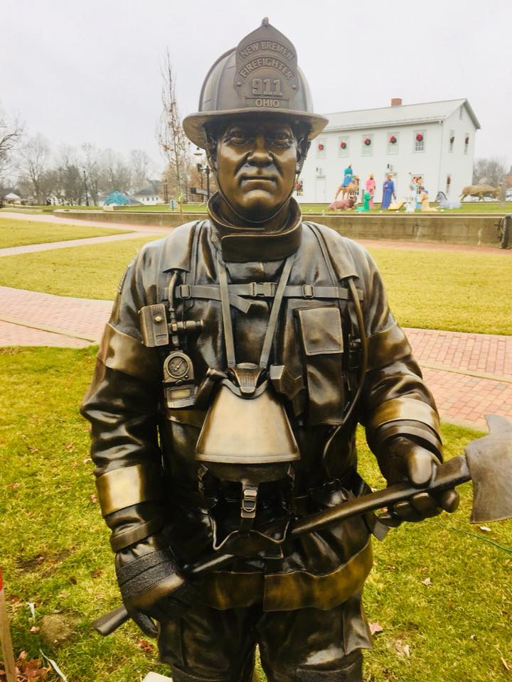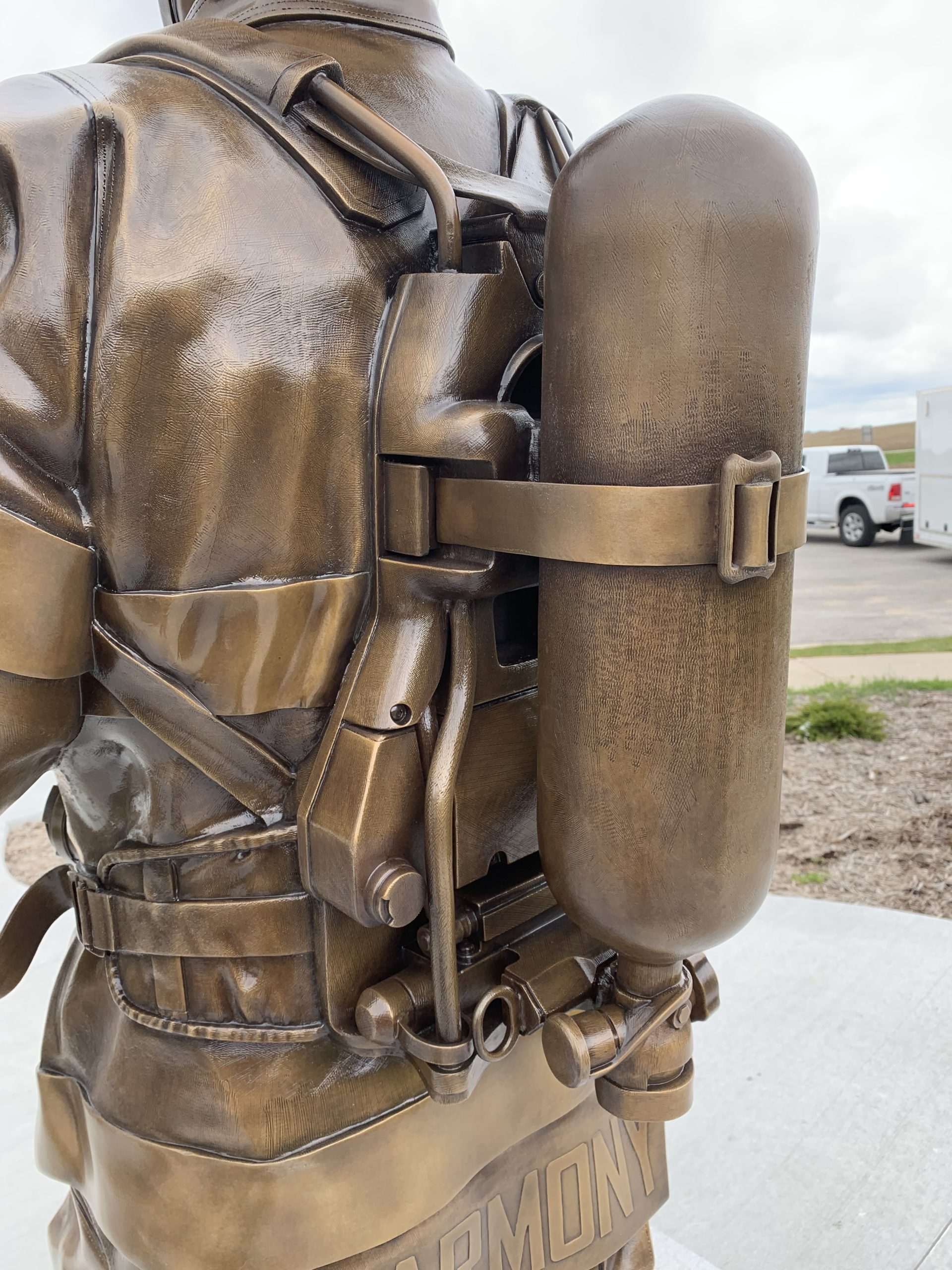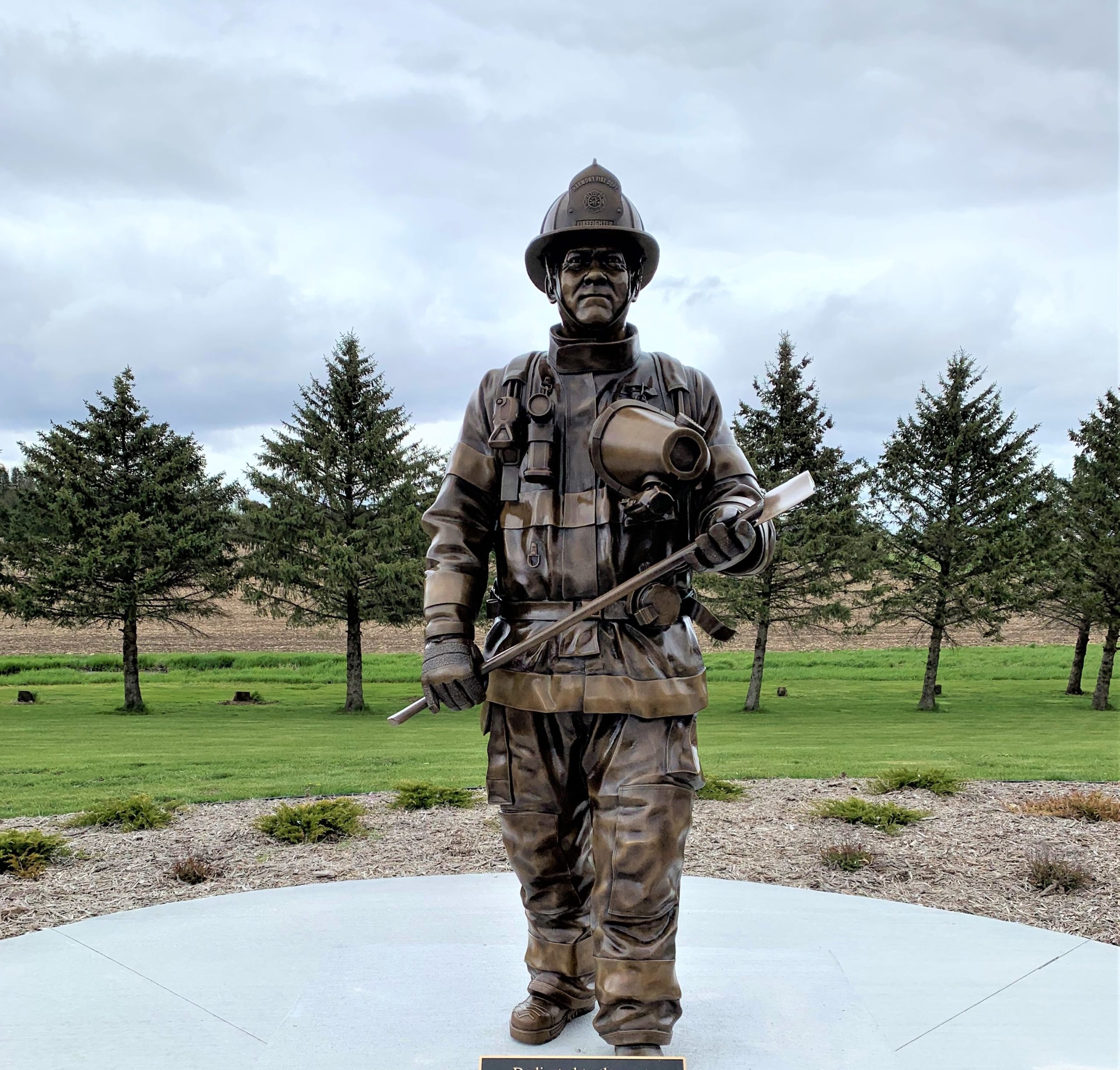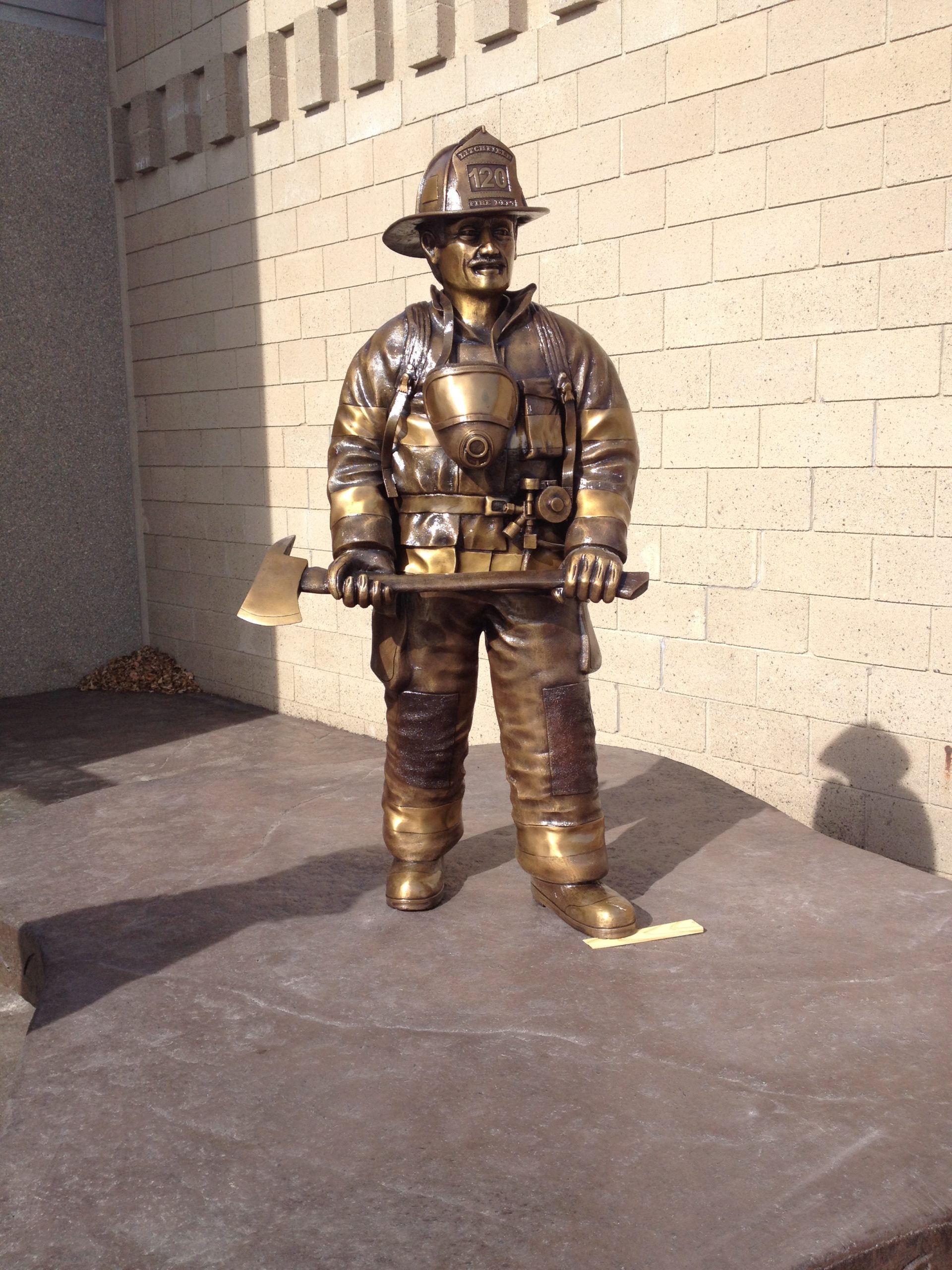 A standing firefighter in full turnout gear holding an axe. Each statue is completely custom to your department. It will be sculpted with your uniform, patches, equipment, and gear. The equipment and gear will be the same makes and models of the items used by your department. For example the same style of helmet or the same make and model of air pack that is worn by your department. You have the choice of sex, race, and age of the statue.