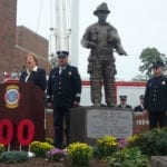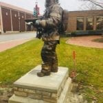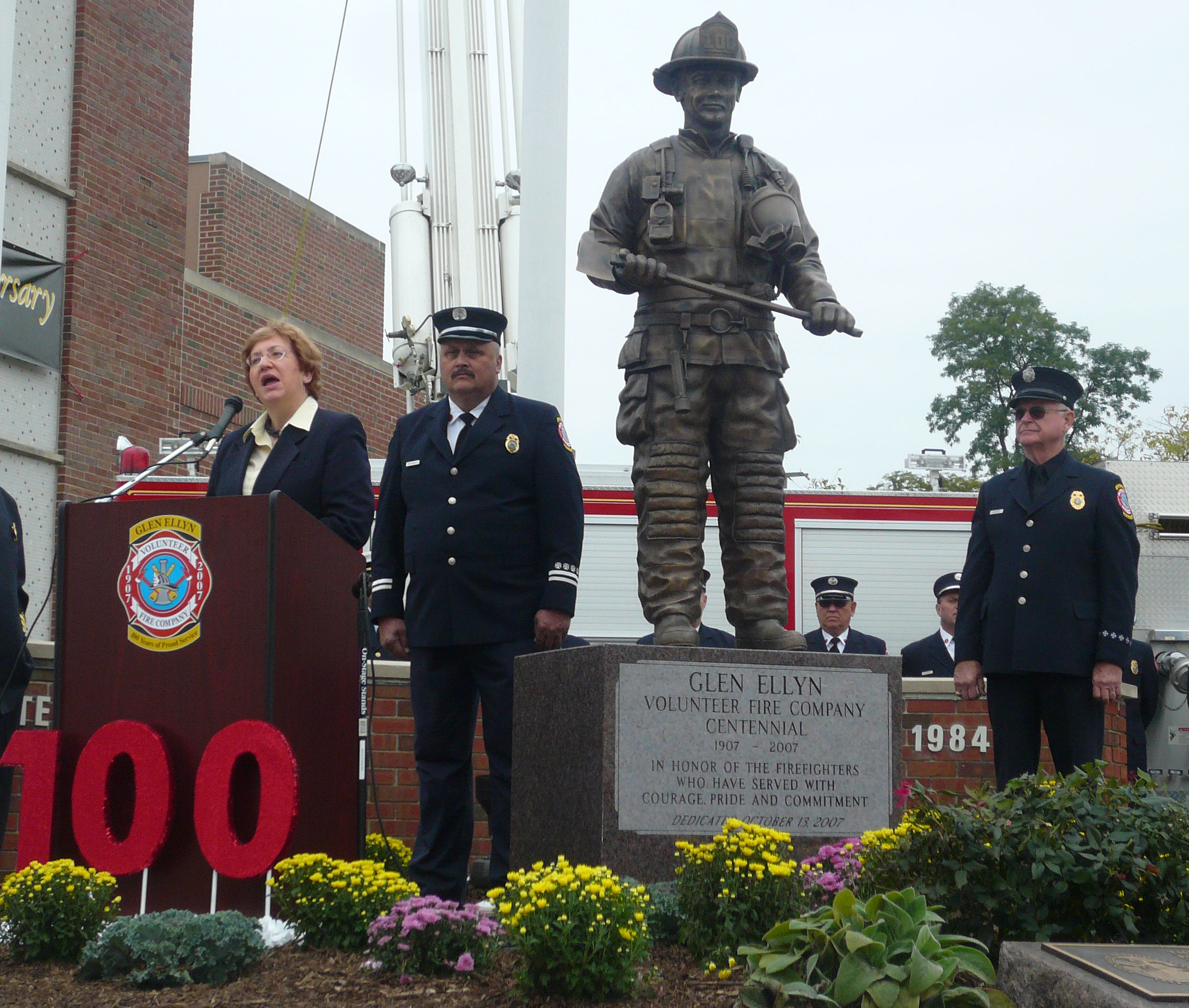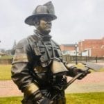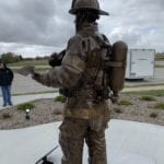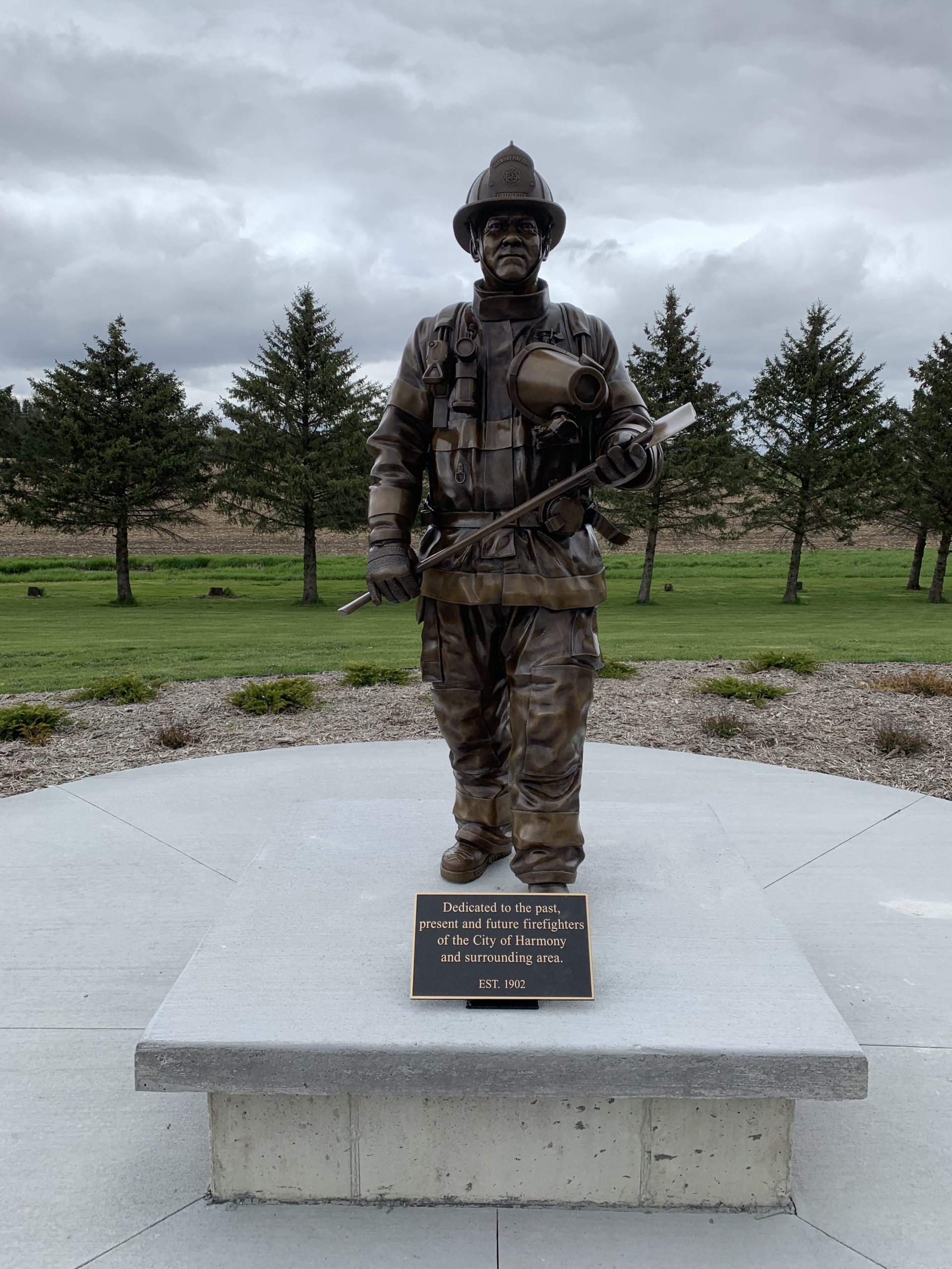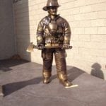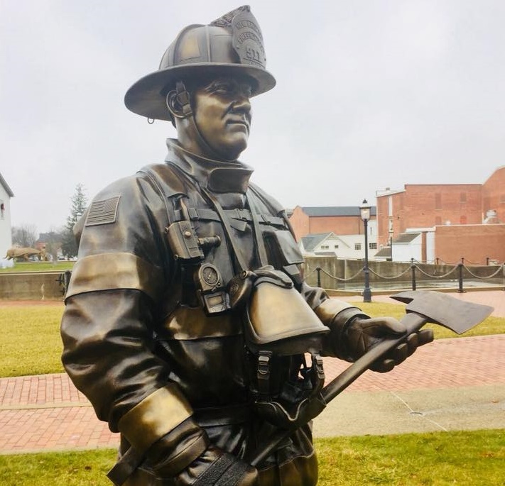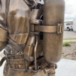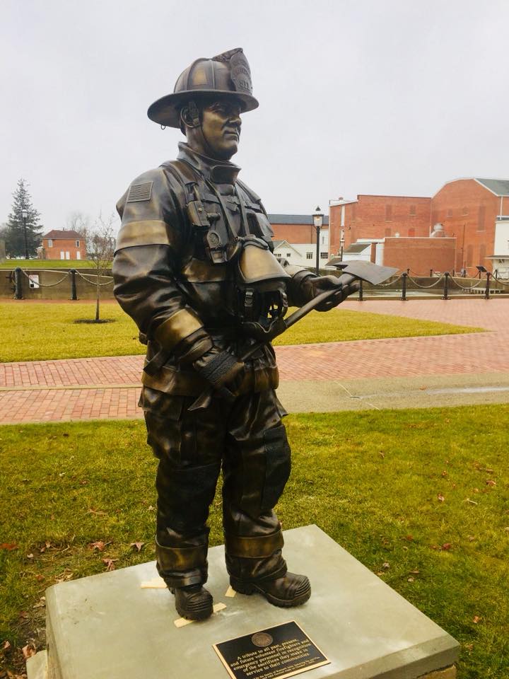 A standing firefighter in full turnout gear holding an axe. Each statue is completely custom to your department. It will be sculpted with your uniform, patches, equipment, and gear. The equipment and gear will be the same makes and models of the items used by your department. For example the same style of helmet or the same make and model of air pack that is worn by your department. You have the choice of sex, race, and age of the statue.
