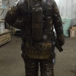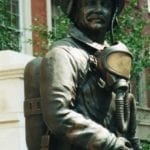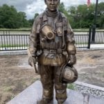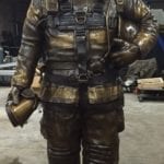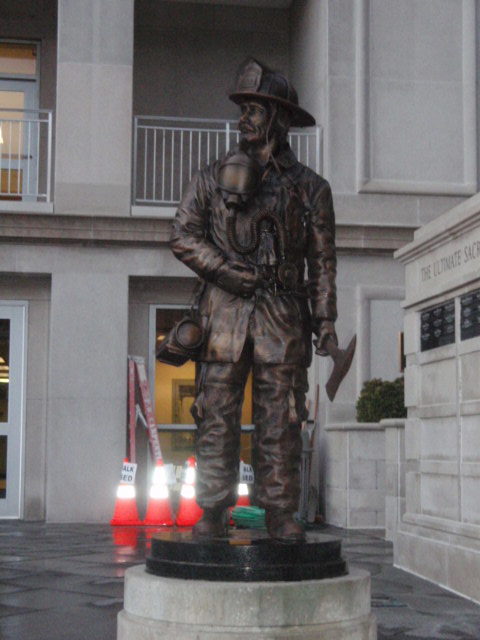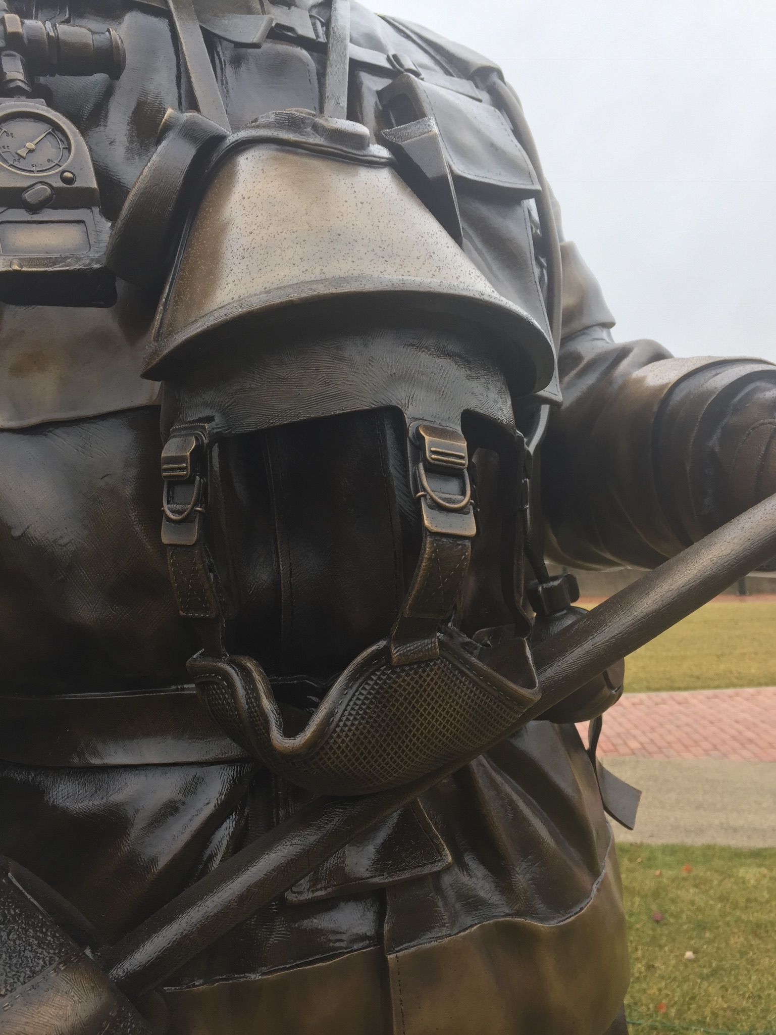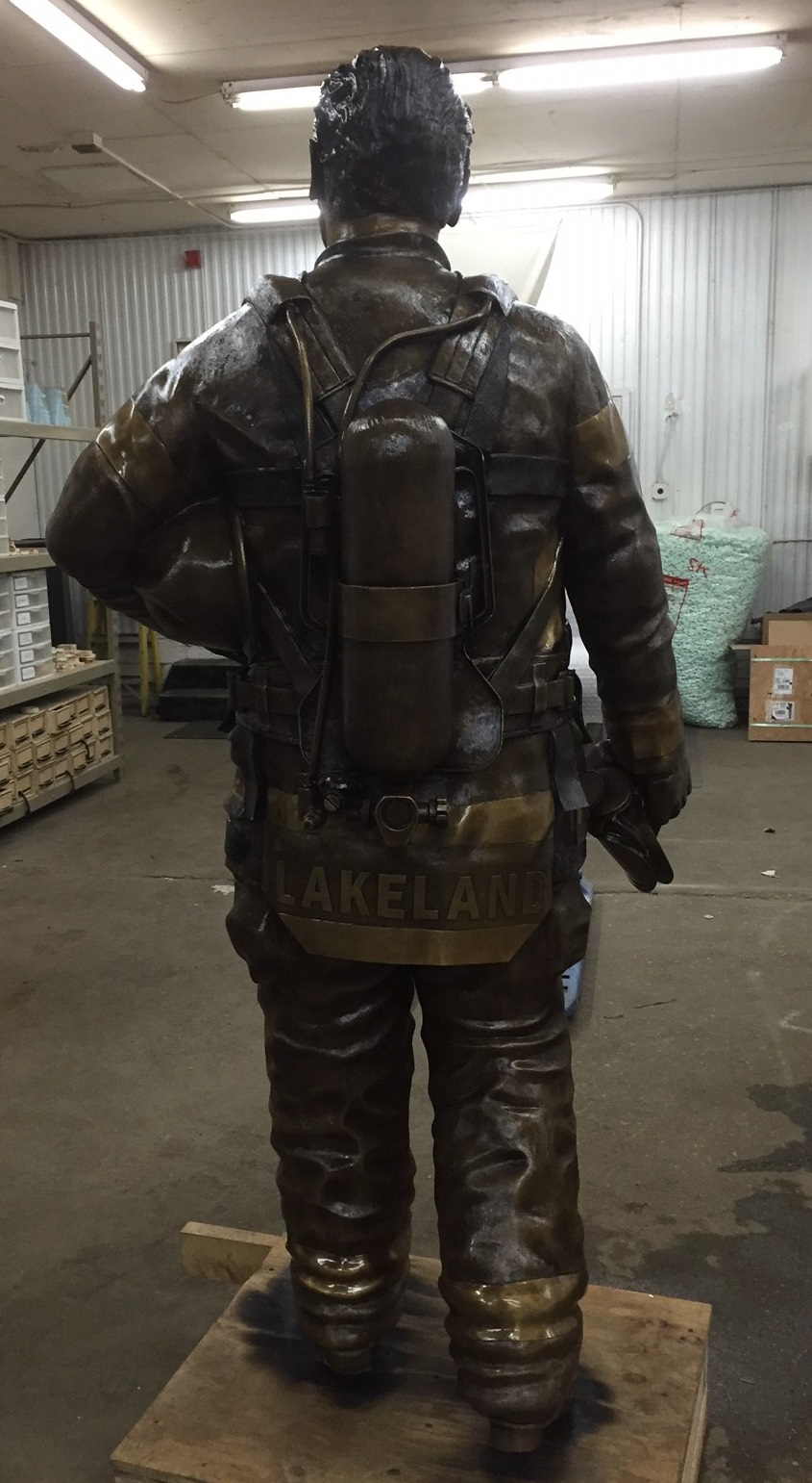 A standing firefighter in full turnout gear. Each statue is completely custom to your department. It will be sculpted with your uniform, patches, equipment, and gear. The equipment and gear will be the same makes and models of the items used by your department. For example the same style of helmet or the same make and model of air pack that is worn by your department. You have the choice of sex, race, and age of the statue.