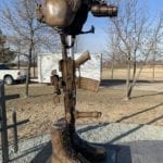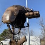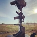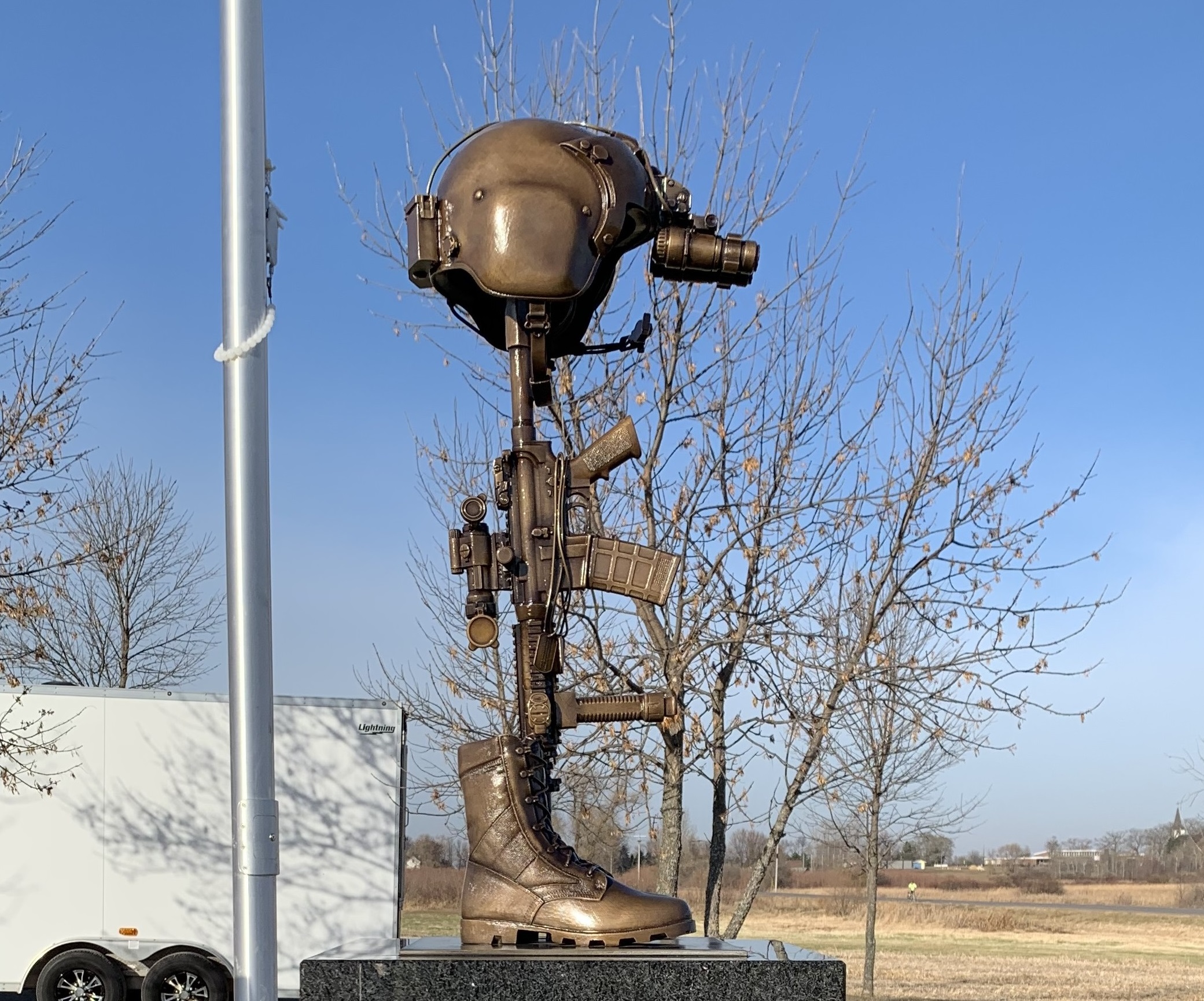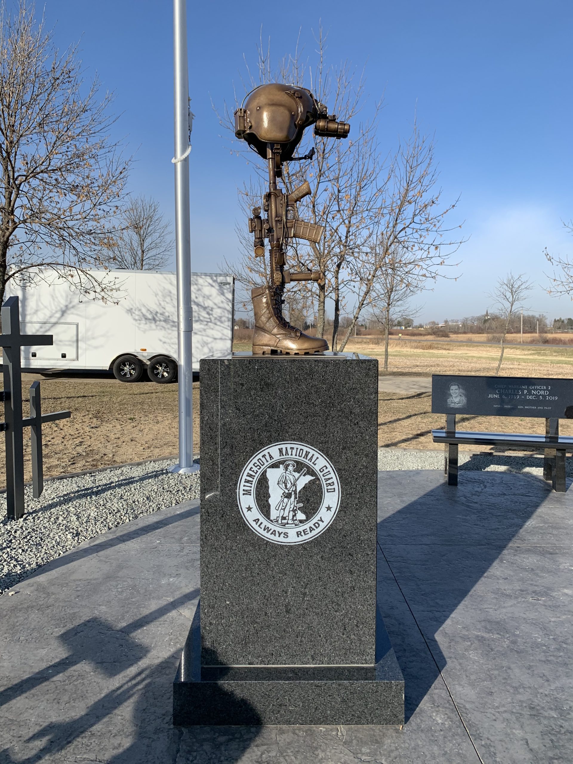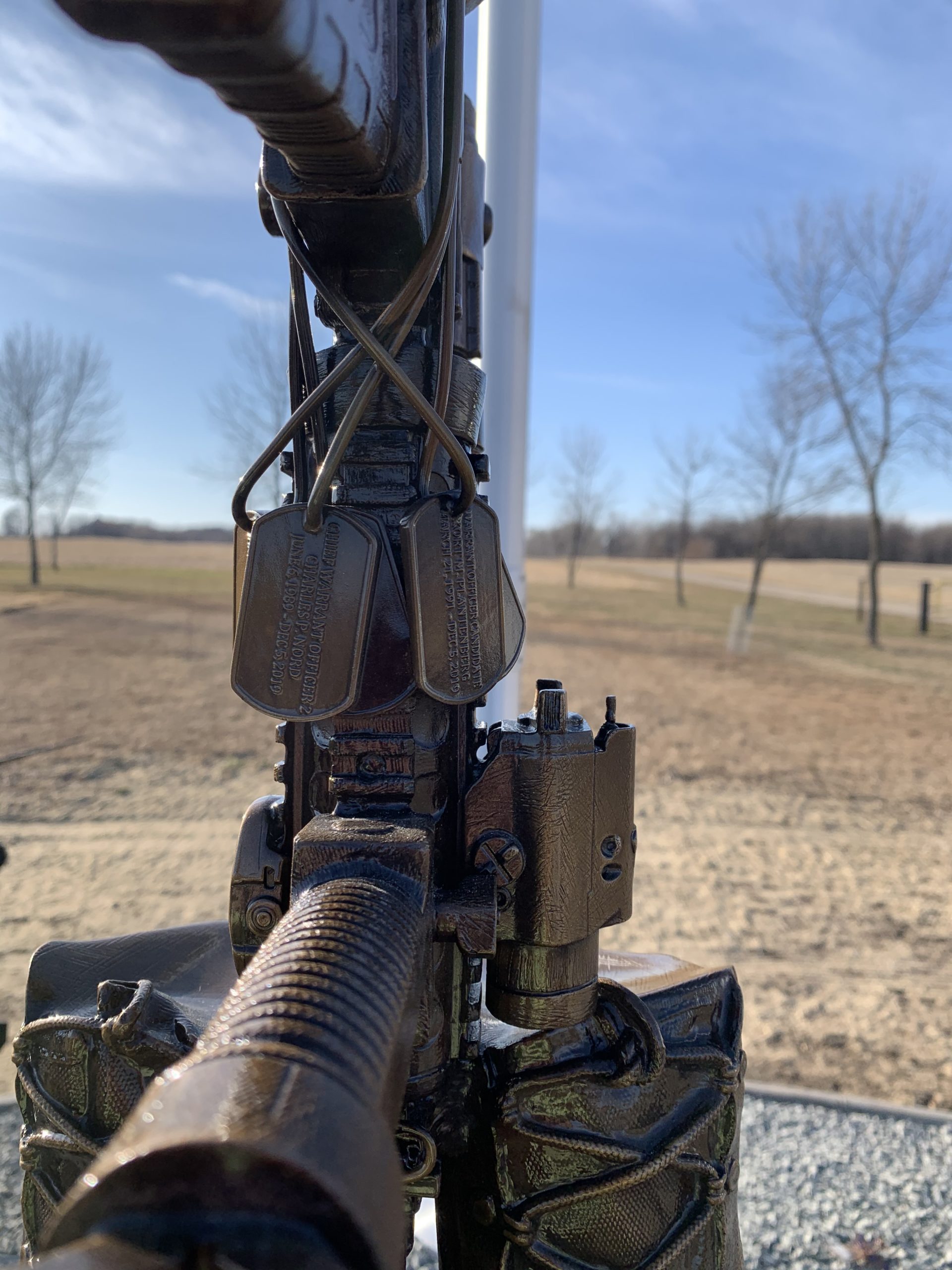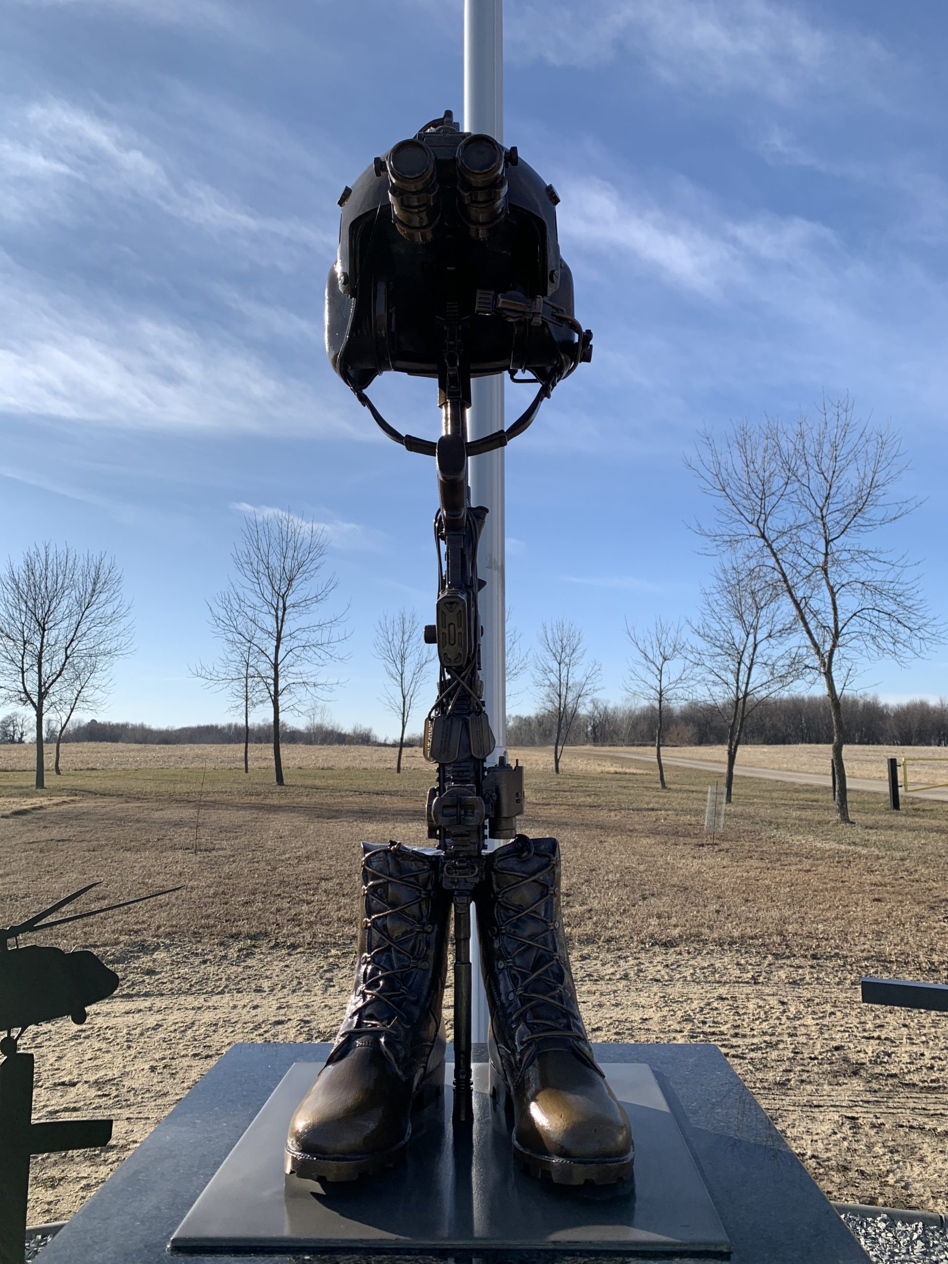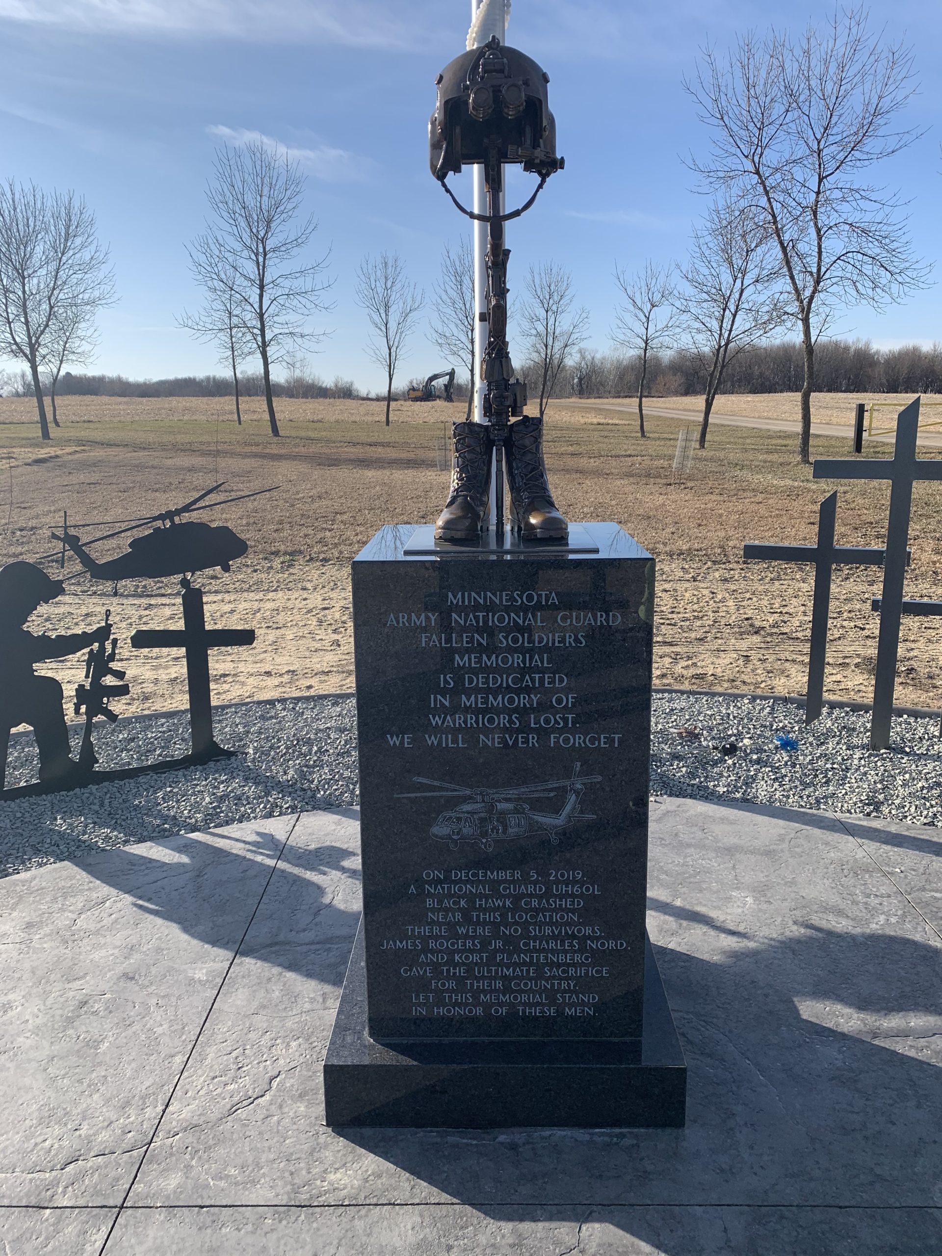 Bronze helicopter battle cross at the Minnesota Army National Guard Fallen Soldiers memorial for the Northstar Dustoff C Co, 2-211 GSAB. On December 5, 2019 a National Guard UH60L Black Hawk crashed and there were no survivors. This memorial honors the fallen soldiers; James Rogers Jr., Charles Nord, and Kort Plantenberg that gave the ultimate sacrifice for their country. This memorial is located in Marty, MN.