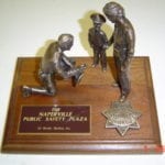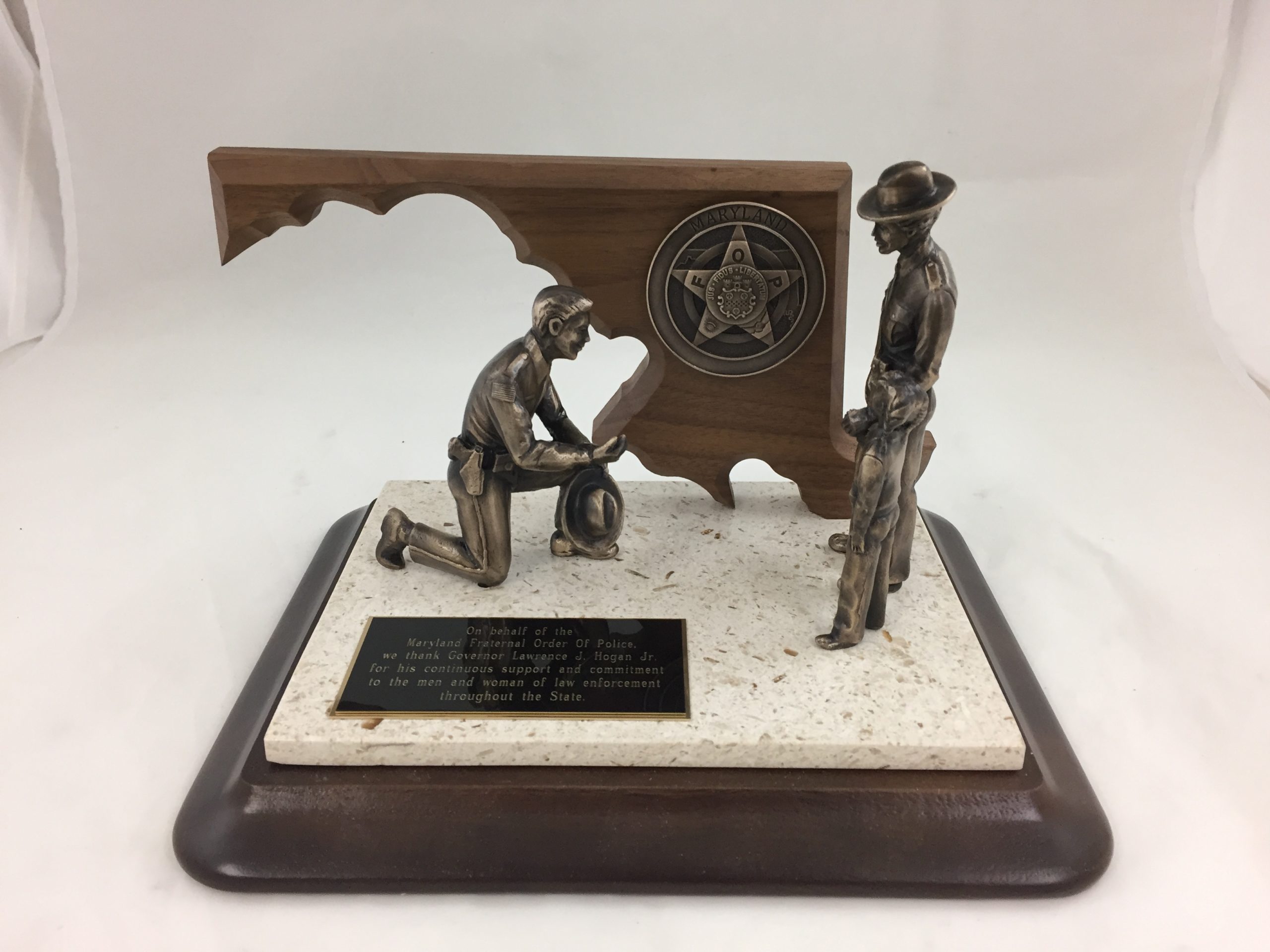The Public Safety statue depicts a police protector holding the hand of a child and another police officer kneeling talking to the child. The 6″ bronze statue comes mounted on a standard walnut base with a replica bronze badge and a brass engraved plate.