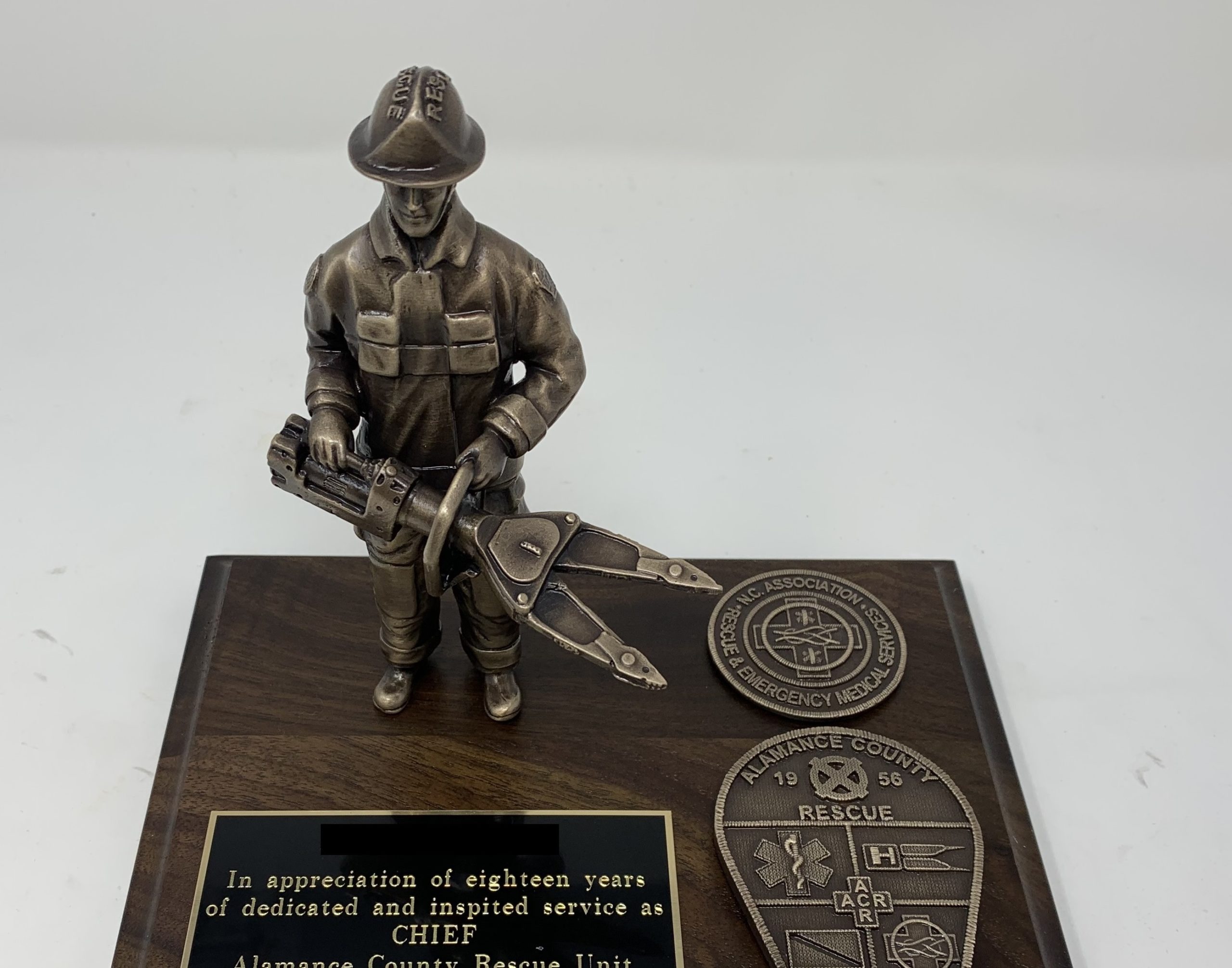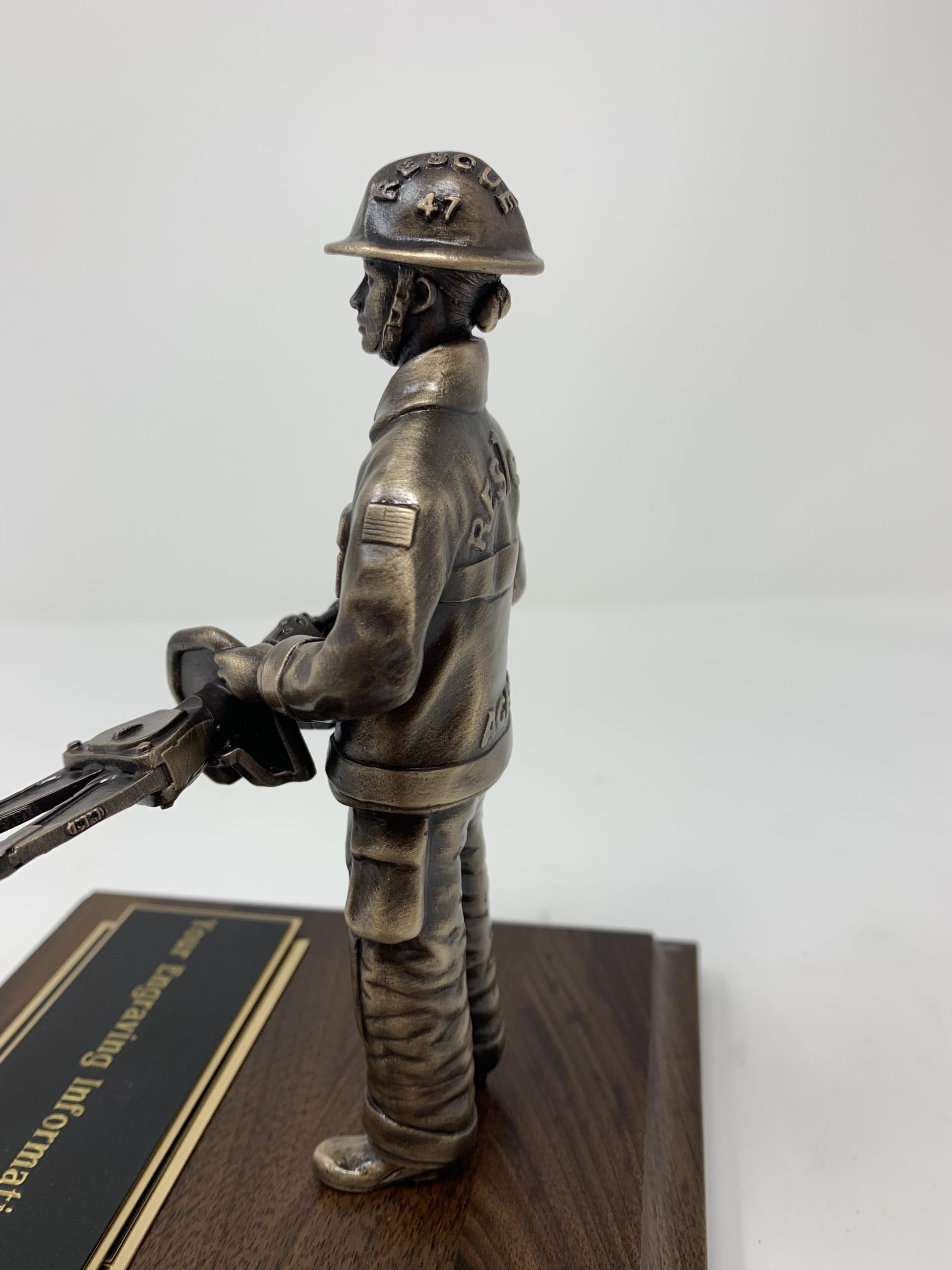 Bronze 6″ rescue personnel with Jaws of Life mounted on a standard walnut base with replica department emblem and engraved plate. $230Personlized Options Optional bases Other Recognition and Retirement Awards ProductsLaw Enforcement Fire Military Custom