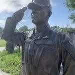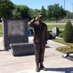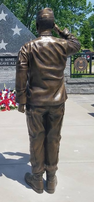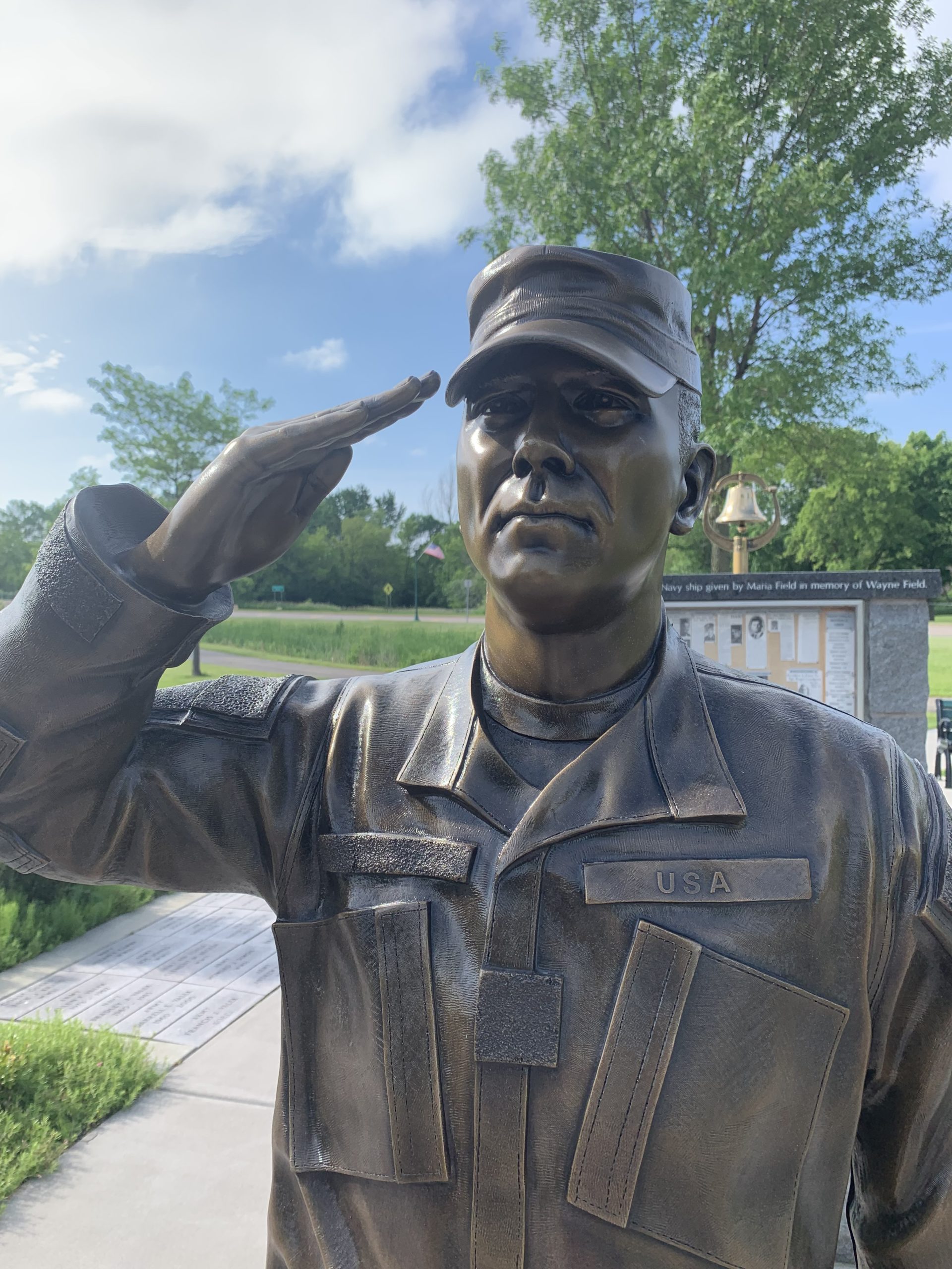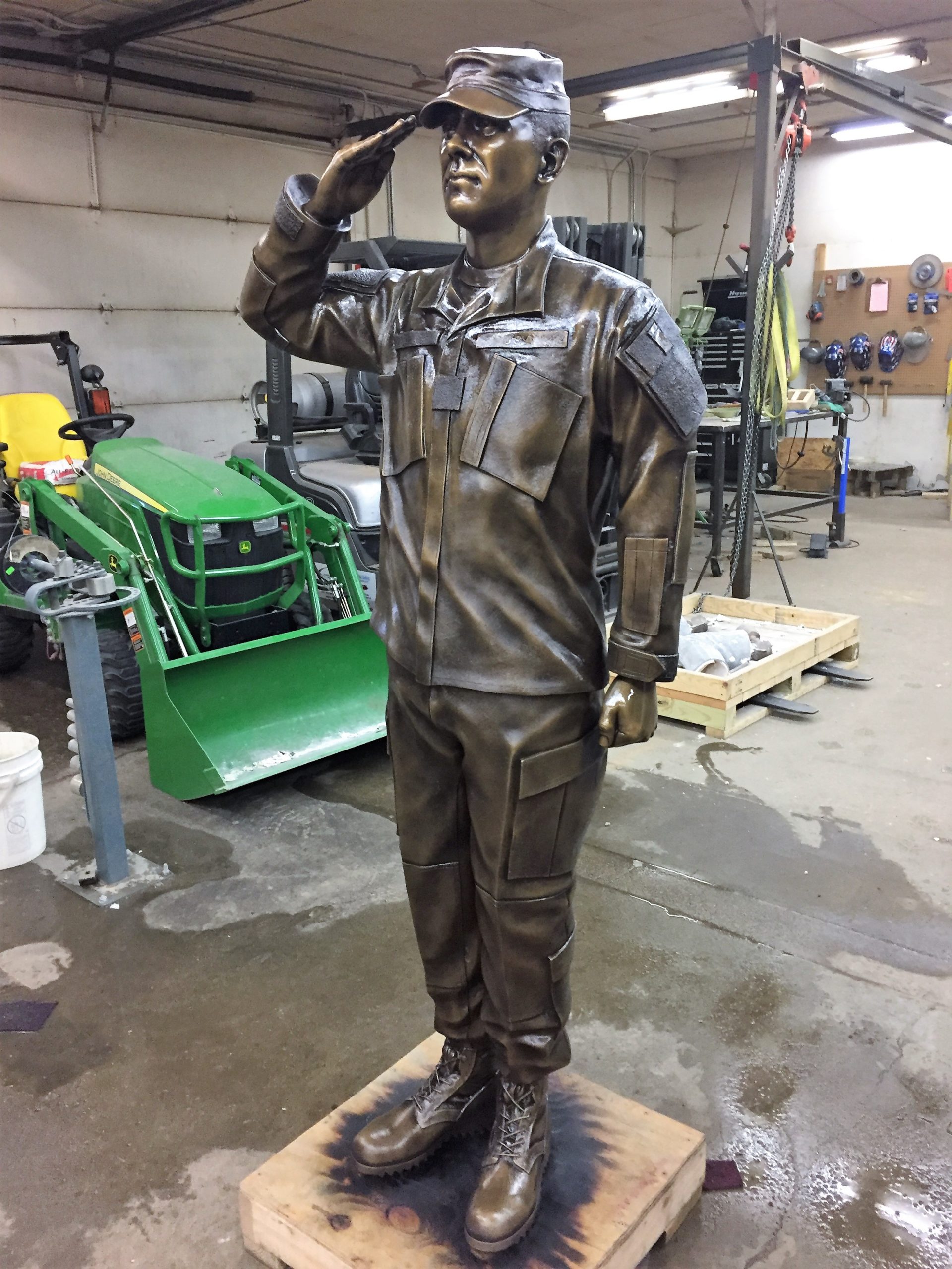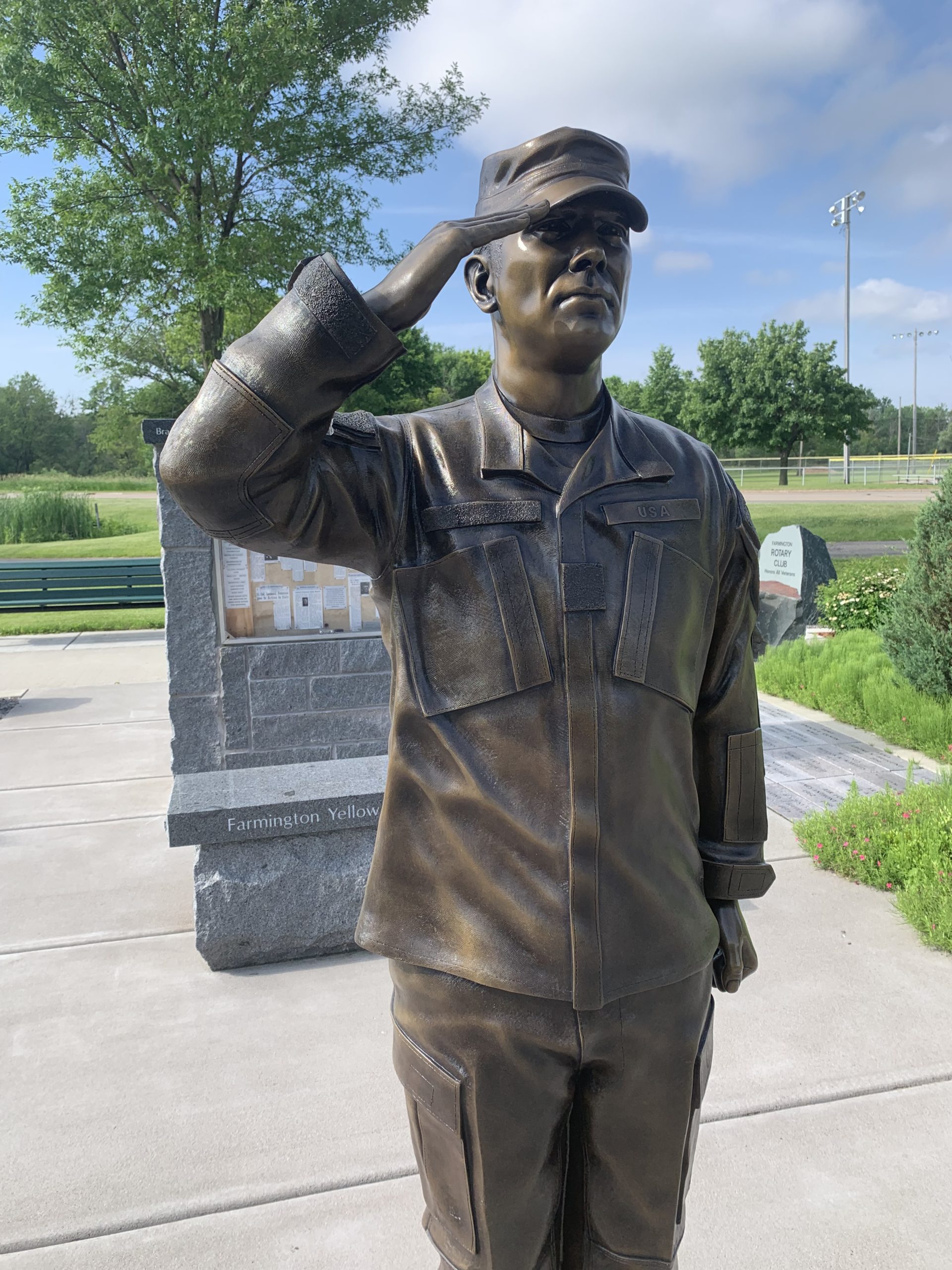 Life-size bronze saluting soldier memorial.  The patches, equipment, and gear are all customized on each statue.  This memorial is located at the Farmington Area Veterans Memorial in Farmington, MN.
