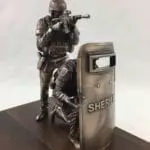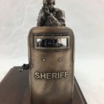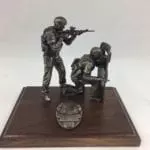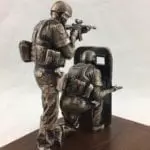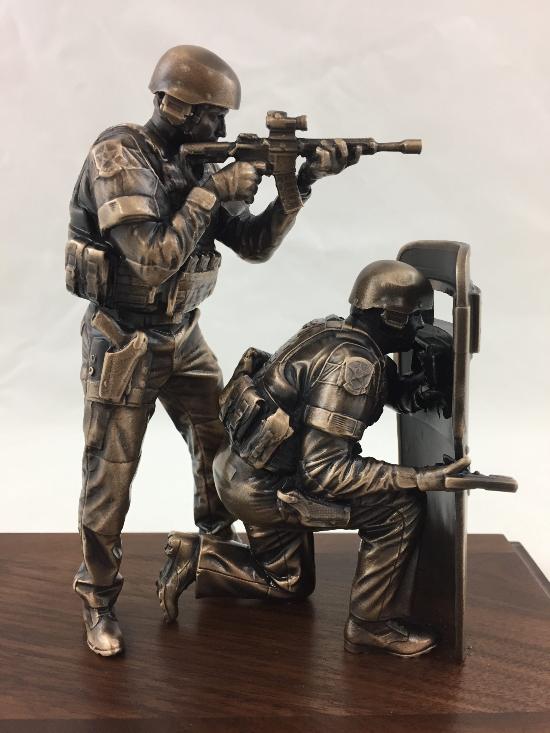 The bronze SWAT entry comes with the 6″ standing SWAT figure, kneeling SWAT figure, and shield mounted on a standard walnut base with a replica department badge and a brass engraved plate. The SWAT figures come customized with your department patches. The SWAT Entry miniature is a replica of the life-size SWAT Entry statues located at Polk County Sheriff Office training facility in Bartow, FL.