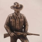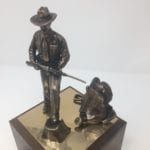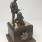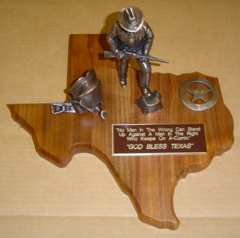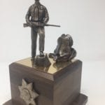 The 6″ bronze miniature depicts a Texas Ranger wearing the traditional custom Stetson, holding the Rifle across his knee, one foot on a tree stump, with the tooled leather saddle resting on the ground next to him. $345Personlized Options Optional bases Other Recognition and Retirement Awards ProductsLaw Enforcement Fire Military Custom