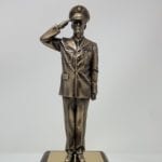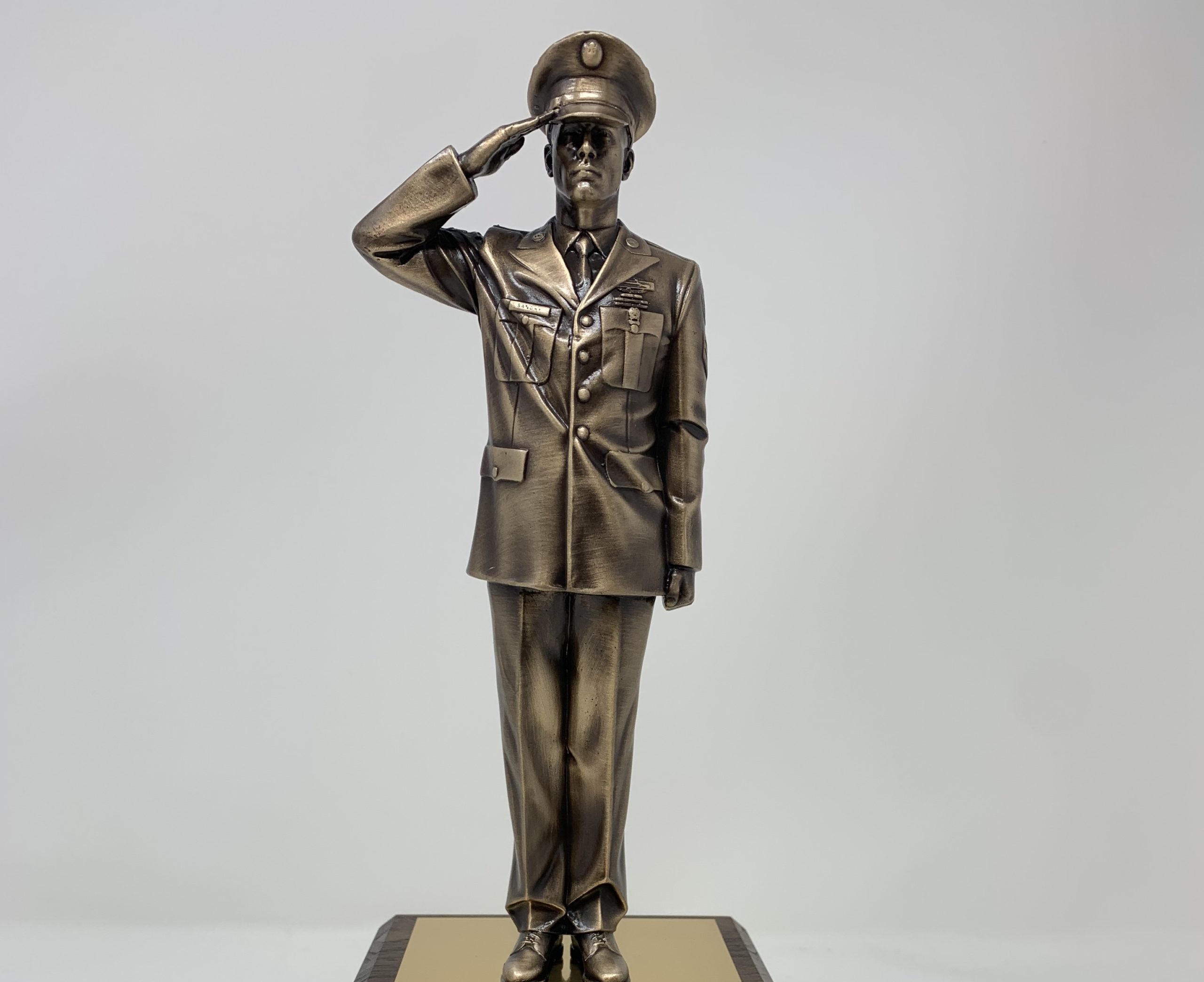 Saluting 8″ soldier in dress uniform mounted on a standard walnut base with a bronze replica military branch emblem and a brass engraved plate.